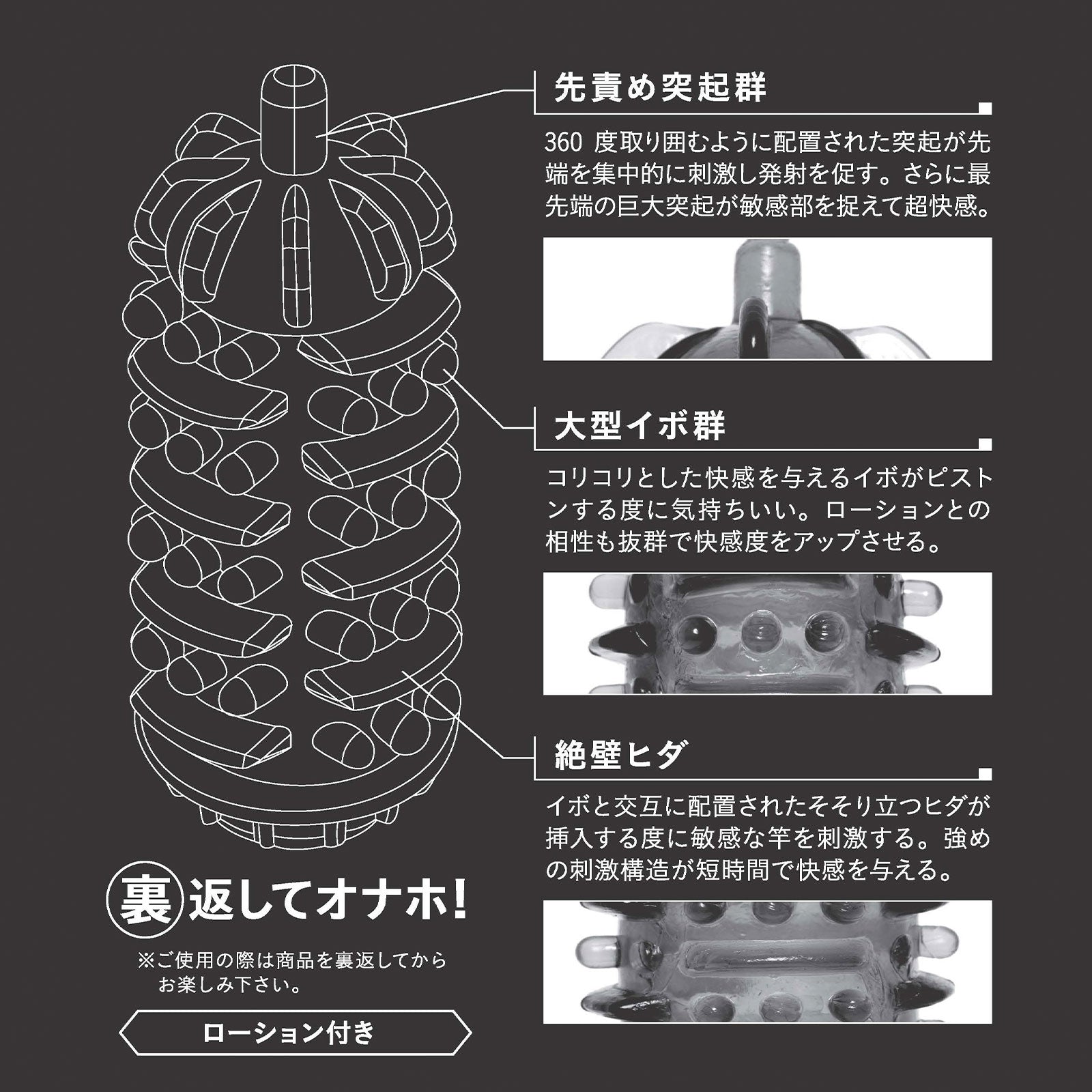 イボとクロス配置されたそそり立ちヒダが何度もち〇ぽを刺激する。強烈刺激構造により短時間でフィニッシュ。